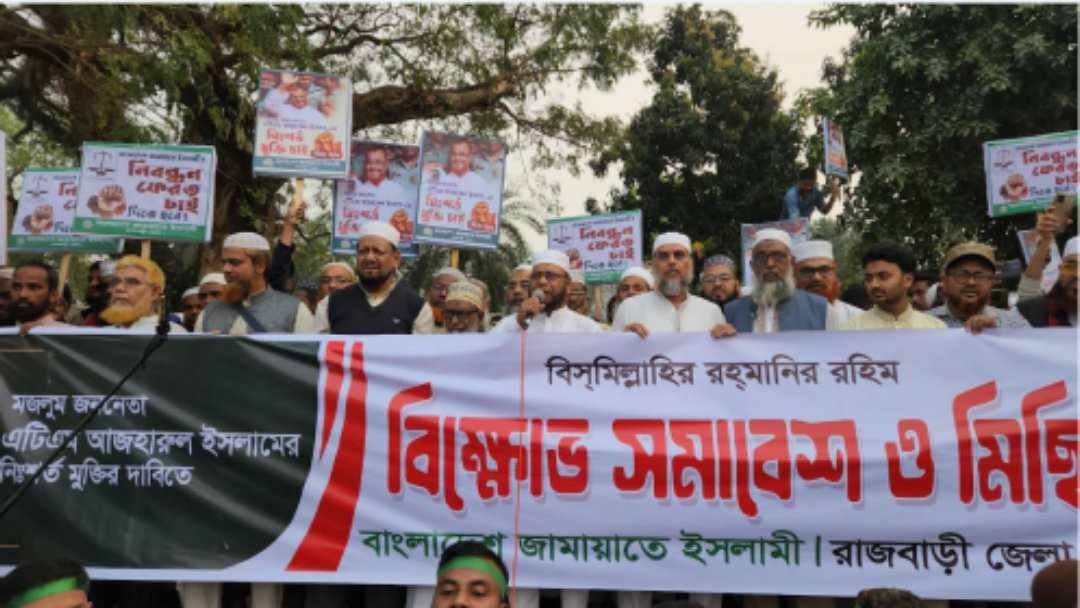 রাজবাড়ীতে এক বিক্ষোভ সমাবেশে বাংলাদেশ জামায়াতে ইসলামী নেতারা দলটির কেন্দ্রীয় মজলিশে শূরা সদস্য ও জেলা আমির নুরুল ইসলাম এর সভাপতিত্বে দলের নেতাকর্মীদের বিরুদ্ধে করা মামলা প্রত্যাহার এবং কারাবন্দি নেতা এটিএম আজহারুল ইসলামের মুক্তির দাবি জানিয়েছেন।