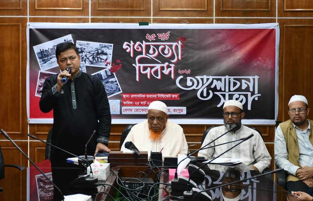 বেগম রোকেয়া বিশ্ববিদ্যালয়, রংপুরে ২৫ মার্চ গণহত্যা দিবস উপলক্ষে আলোচনা সভা অনুষ্ঠিত হয়েছে। আজ মঙ্গলবার (২৫ মার্চ, ২০২৫) সকালে বিশ্ববিদ্যালয়ের প্রশাসনিক ভবনের সিন্ডিকেট রুমে আয়োজিত এই সভায় প্রধান অতিথি হিসেবে উপস্থিত ছিলেন উপাচার্য প্রফেসর ড. মোঃ শওকাত আলী।