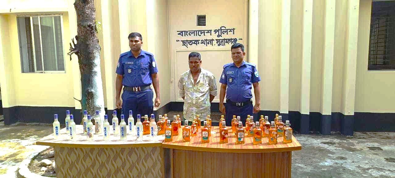 সুনামগঞ্জে ছাতকে পুলিশের বিশেষ অভিযানে ৫০ বোতল ভারতীয় মদসহ গ্রেফতার ১