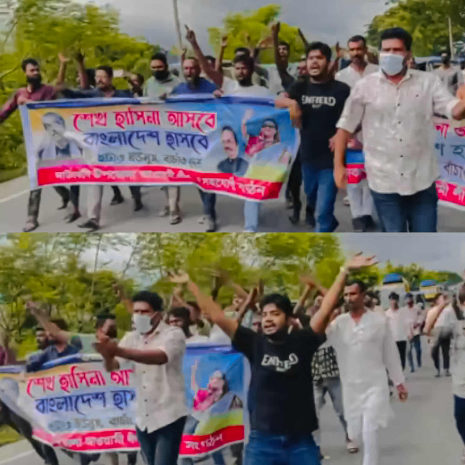 ভিডিওতে দেখা যায়, দাউদকান্দি উপজেলা ছাত্রলীগের সাবেক সাংগঠনিক সম্পাদক মো. বিল্লাল হোসেন আপনের নেতৃত্বে কর্মীরা “শেখ হাসিনা আসবে, বাংলাদেশ হাসবে” লেখা ব্যানার নিয়ে স্লোগান দিতে থাকেন।